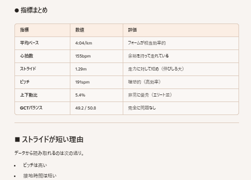 最近の出来事 ランニングフォームの修正 2026年3月18日 nsnjx307 先日の「静岡マラソン」のログを見て、ストライドが短くなっていたのが気になり、AIに診断してもらった。的確に弱点を指摘しており、走力・データからストライドが140CMになる可能性が …