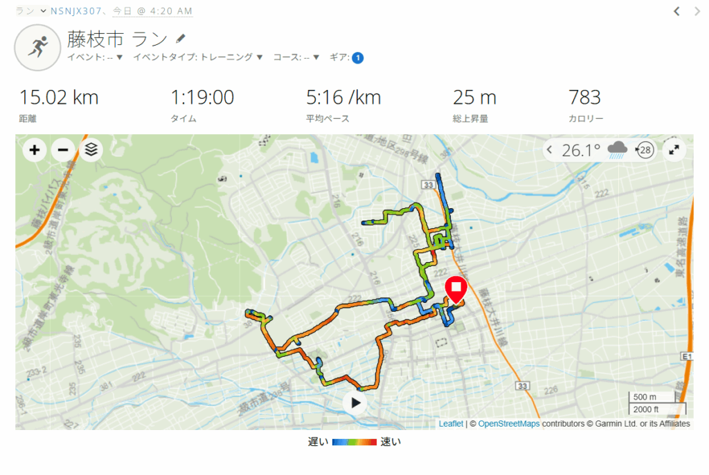 雨の中レインウエアを着て、早朝4:20スタート。靴は、「asics GEL-VENTURE8」。自宅から駅南公園、青木中央公園を経由して起伏走のため駿河台に向かうが、雷と土砂降りに遭遇し、視界も悪く中止を決める。自宅に引き返すが、途中で小雨になったため、下青島、内瀬戸、岩城神社、青葉町を経由して自宅に戻り15KM完走。本日出来なかった30KM起伏走は、明日実施したい。