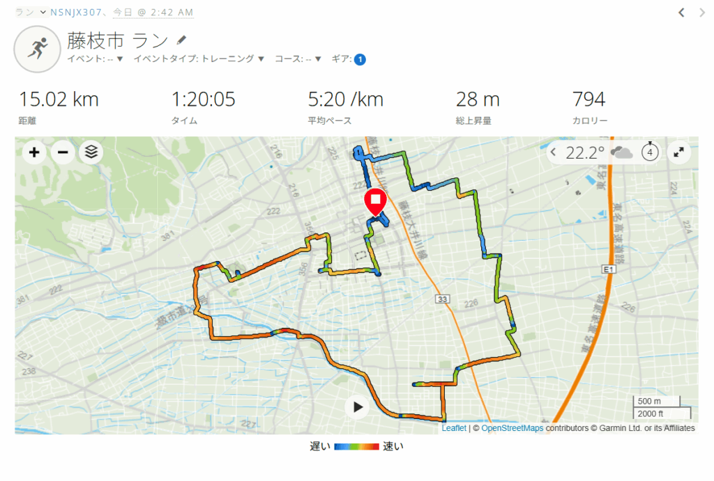 早朝2:42スタート。靴は、「workman ハイバウンス オーバードライブ⑩」。自宅から駅南公園、田沼南公園、前島、岩城神社、青南町、泉町、高洲、与左衛門稲荷神社、小石川町、青木中央公園を経由して自宅に戻り15KM完走。今日は、30KMJOGの予定だったが、途中で左足のふくらはぎが張り始め、ペースダウンしても良くならず、15KMで断念。無理をして肉離れになる可能性もあるので、やむを得ない。明日以降、状態を確認したい。