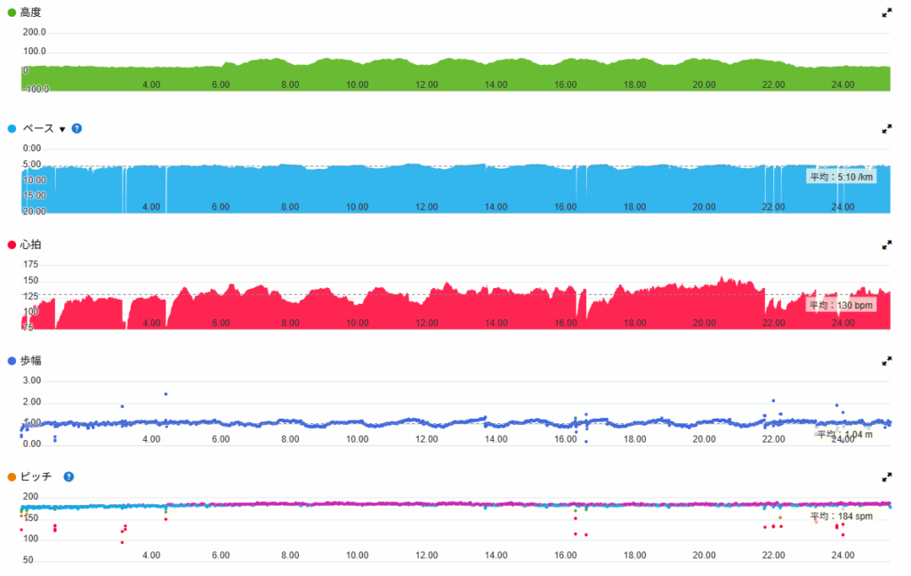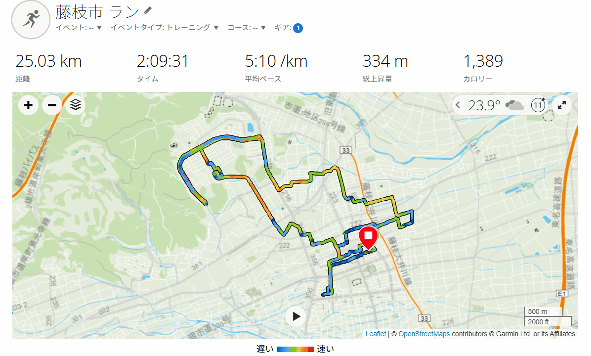 早朝3:29スタート。靴は「workman ハイバウンス オーバードライブ⑩」。自宅から藤枝駅、前島、小石川町、青木中央公園を経由して駿河台に向かう。ランニングフォームは、股関節からの加重、浮遊感、足振りを意識する。駿河台のコースを4.5周して自宅に戻り、25KM完走。最初は台風の影響で風が強く走り難かったが、途中で収まり助かった。