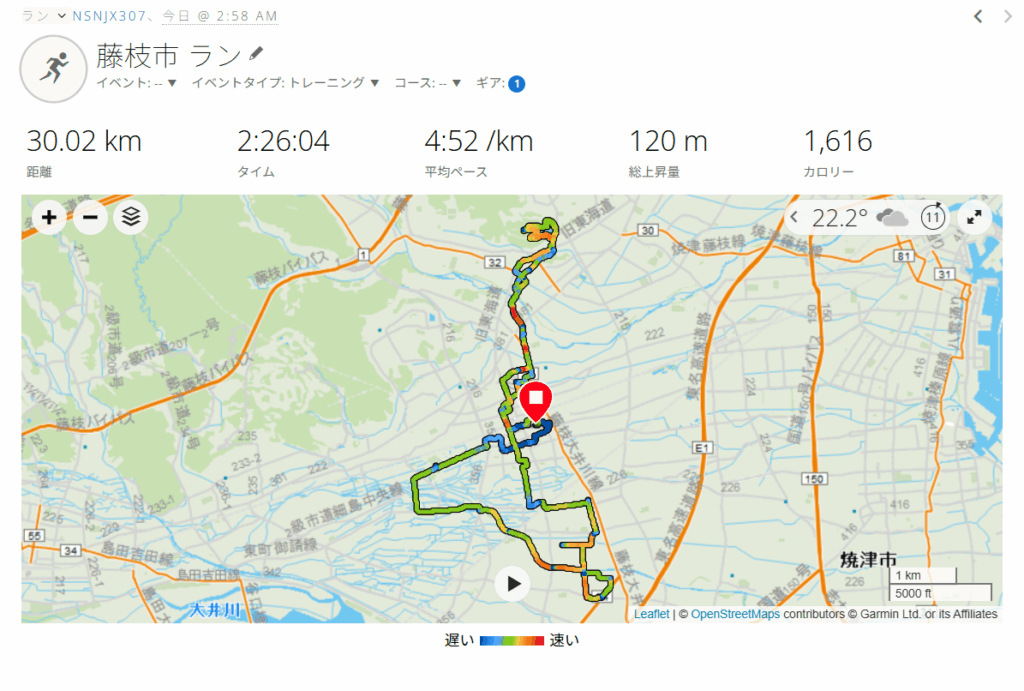 雨の中レインウエアを着て、早朝2:58スタート。靴は、「workman ハイバウンス オーバードライブ⑩」。自宅から駅南公園、静岡県武道館、岩城神社、青南町、高岡、大東町、泉町、高洲、青木中央公園を経由して蓮華寺池公園に向かう。公園の温度計は「20℃」を示していて走りやすい。池の周囲を7周してから自宅に戻り30KM完走。レース前、最後の30KMJOGだったが、良いトレーニングが出来たと思う。