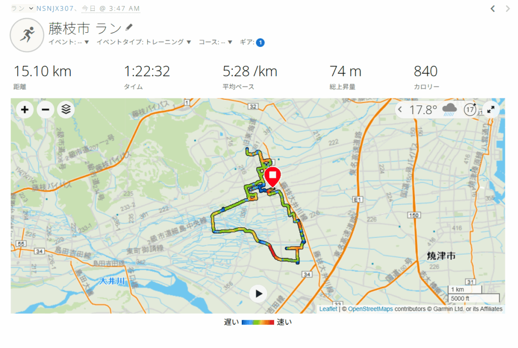 雨の中レインウエアを着て、早朝3:47スタート。靴は、「asics GEL-VENTURE8」。自宅から駅西公園、青木中央公園、白山神社、岩城神社、青南町、高岡、泉町、高洲を経由して自宅に戻り15KM完走。昨日の30KMJOGの影響か身体が重く、雨もありペースは上がらなかった。