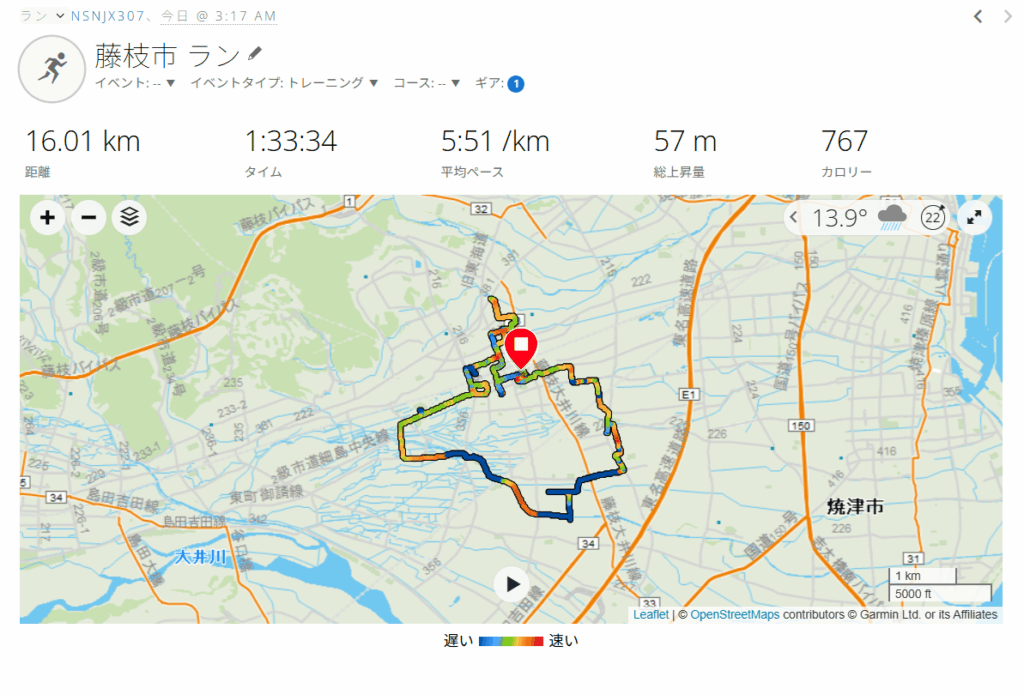 早朝3:17スタート。靴は、「workman ハイバウンス オーバードライブ⑩」。自宅から静岡県武道館、青木中央公園、岩城神社、青南町、高岡、泉町、高洲、与左衛門稲荷神社、高柳を経由して自宅に戻り予定よりも少し長めの16KM完走。左足に不安があるので、起伏走を止めてペースを下げてJOG。今週末のレースでは不安なく走りたいが。。。