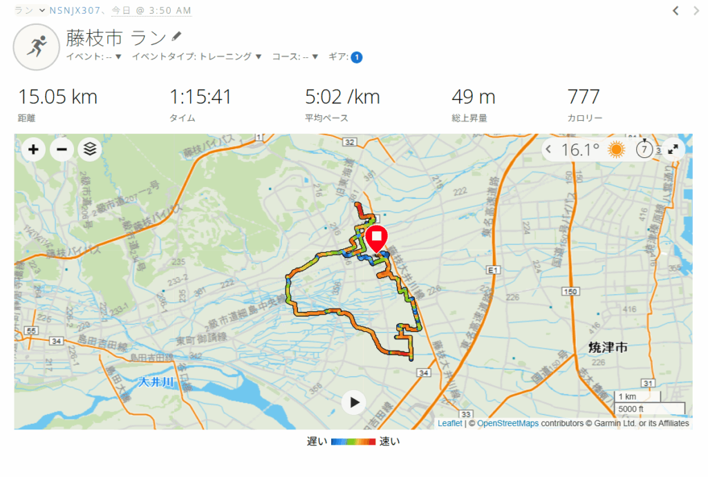 早朝3:50スタート。靴は、「workman ハイバウンス オーバードライブ➉」。自宅から駅南公園、駅西公園、青木中央公園、下青島、青南町、高岡、泉町、高洲を経由して自宅に戻り15KM完走。昨日、気になった右足のハムストリングスの張りは問題なかった。