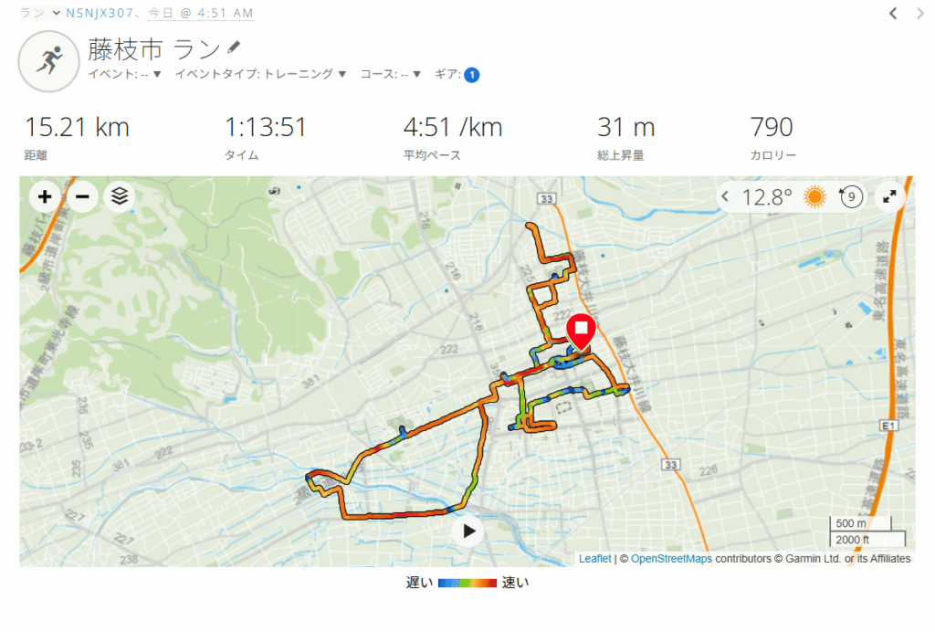 早朝4:51スタート。靴は、「adidas supernova rise2」。自宅から藤枝駅、前島、青木中央公園、岩城神社、青南町、青葉町を経由し自宅に戻り、15KM完走。今日は、疲労が抜けて良い感じで走ることが出来た。