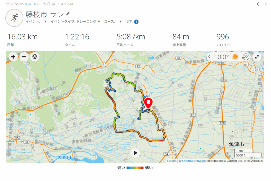 早朝2:46スタート。靴は、「adidas supernova rise2」。自宅から前島神社、前島、青木中央公園、白山神社、志太郡衙跡、藤枝市民グラウンド、駿河台、瀬戸染飯伝承館、青南町、高岡、泉町、高洲を経由して自宅に戻り、予定よりも少し長めの16KM完走。ランニングフォームは、腰の位置と股関節の角度を意識した。
