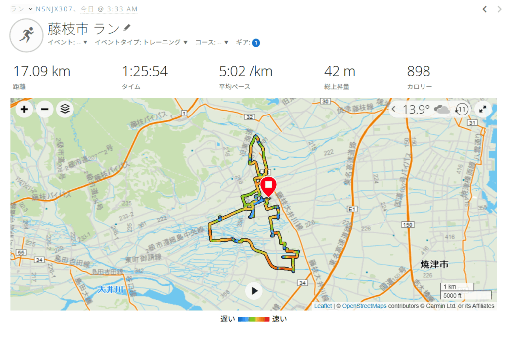 早朝2:16スタート。靴は、「adidas supernova rise2」。自宅から藤枝駅、前島、青木中央公園、志太、勝草橋、岩城神社、青南町、泉町、高洲、高岡を経由して自宅に戻り、予定よりも少し長めの17KM完走。ランニングフォームは股関節の角度、加重、ばねを意識した。