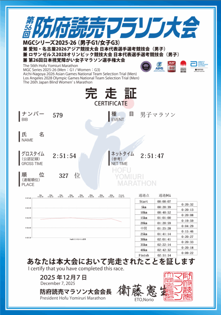 ネットタイムは2:51:47。目標だった2時間55分を切ることが出来た。2023年1月の「勝田全国マラソン」以来の2時間51分台でセカンドベストである。「しまだ大井川マラソン」で課題だったストライドが6CM伸び、ストライドとピッチも安定し、かなりランニングフォームが修正出来た。ランニングフォームは、もう少し力を抜ければタイムが伸びる余地があると思う。目標の2時間55分切りを達成して、ランニングフォームも修正出来、有意義なレースだった。