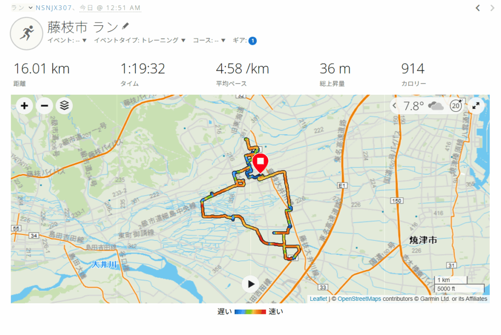 早朝3:14スタート。靴は、「adidas supernova rise2」。自宅から青木中央公園、岩城神社、青南町、高岡、大洲、泉町、高洲、兵太夫を経由して自宅に戻り、予定よりも少し長めの16KM完走。マラソンの疲労はだいぶ抜けたと思うが、ハムストリングスの張りは注視したい。