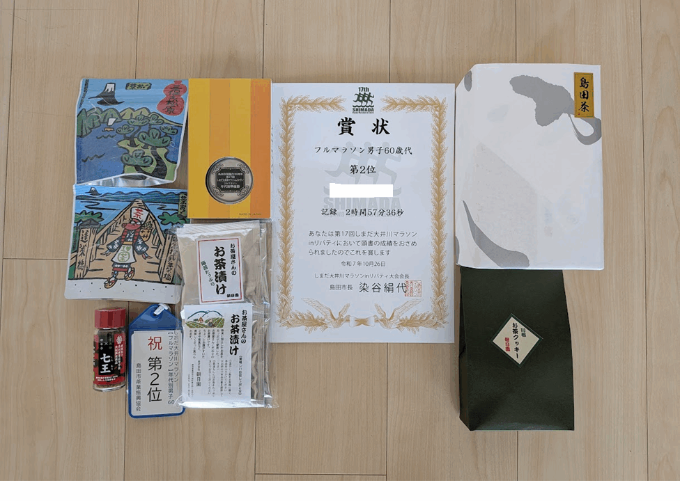 先日、「第17回しまだ大井川マラソン」の男子60歳台2位の賞品が届いた。賞状、メダル、お茶、クッキー、お茶漬け、一味唐辛子等で、有り難く使わせていただく。年代別の入賞は、年齢を重ねるとともに難しくなるが、来年も入賞目指して頑張りたい。