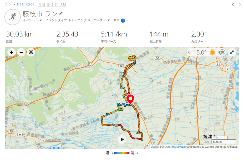 早朝2:31スタート。靴は、「adidas supernova rise2」。自宅から藤枝駅、駅西公園、岩城神社、青南町、泉町、青木中央公園を経由して蓮華寺池公園に向かう。公園の温度計は「0℃」を示していて寒い。池の周囲を9周して自宅に戻り30KM完走。マラソン後、初めての30KMJOGだったが、無事に走ることが出来て一安心。