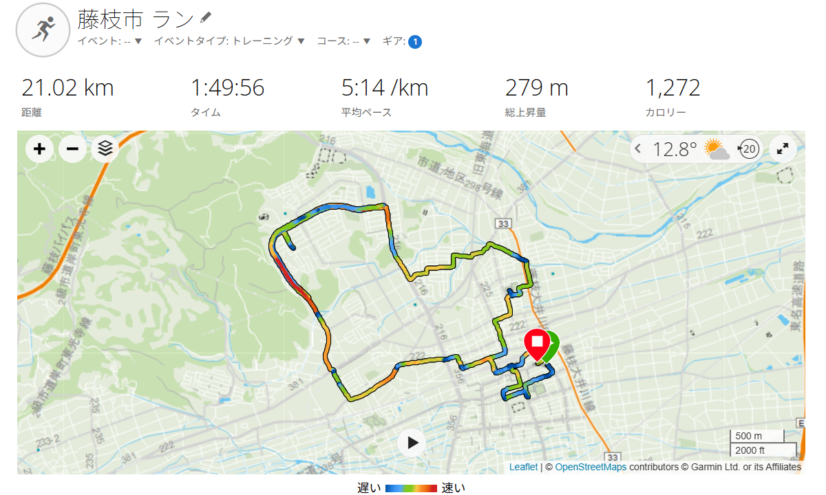 早朝3:12スタート。靴は「adidas supernova rise2」。自宅から駅南公園、静岡県武道館、藤枝駅、青木中央公園、東町公園を経由して駿河台に向かう。ランニングフォームは、足の引きつけ、腰の入った加重、加重による足の引き上げ、腕振り、リズムとリラックスを意識する。駿河台のコースを3.5周してから自宅に戻り、予定よりも少し長めの20KM完走。