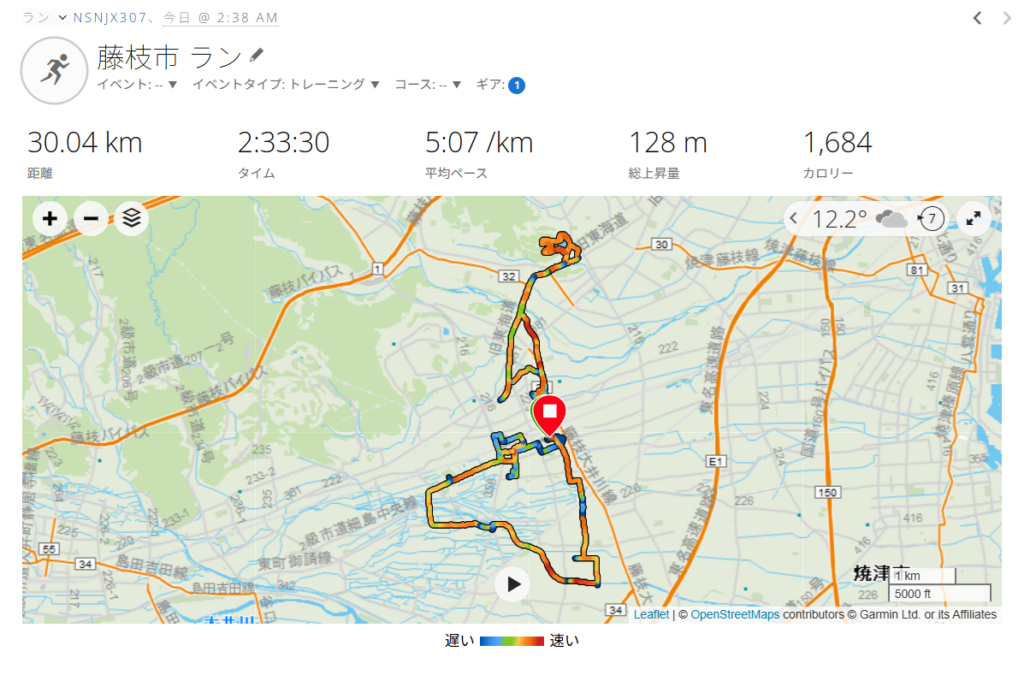 早朝2:38スタート。靴は、「adidas supernova rise2」。今日は「スマイリーエンジェル合同練習」で30KM走る予定だったが、雨予報のため中止になった。30KMJOGに変更し、自宅から駅南公園、藤枝駅、駅西公園、岩城神社、青南町、泉町、兵太夫、青木中央公園、東町公園、南新屋を経由して蓮華寺池公園に向かう。公園の温度計は「11℃」を示していて寒さは感じない。池の周囲を7周してから自宅に戻り、30KM完走。途中で小雨に降られたが、止んだので助かった。