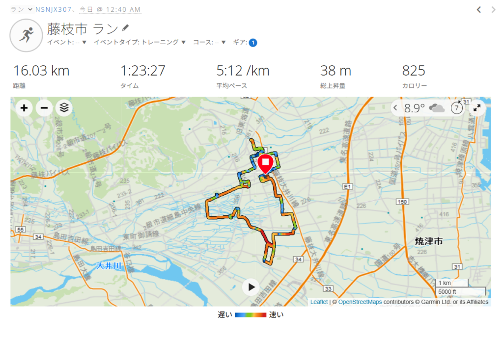 雨を避けるため、深夜0:40スタート。靴は、「adidas supernova rise2」。自宅から藤枝駅、小石川町、青木中央公園、岩城神社、青南町、青葉町、泉町、高洲を経由して自宅に戻り、予定よりも少し長めの16KM完走。昨日、30KM走ったためか身体が重かった。