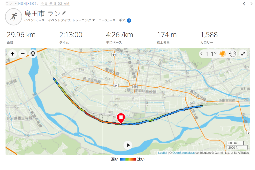 準備運動をしてから8:02スタート。靴は、「Nikeエア ズーム アルファフライ ネクスト%2」。ペーサーは、フリー走行にしたラスト5KM以外は4:30/KM±10秒以内で終了。ラスト2KMは、4:00/KMまで上げたので、良いトレーニングになった。