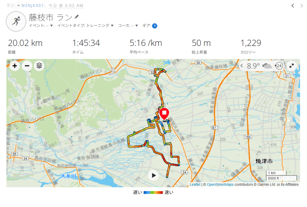 早朝3:02スタート。靴は、「adidas supernova rise2」。自宅から田沼南公園、駅南公園、駅西公園、岩城神社、青南町、青葉町、大洲、泉町、高岡、青木中央公園、千歳公園、龍王神社を経由して自宅に戻り20KM完走。今日は昨日よりも身体が重さが軽減されて、走りやすくなった。