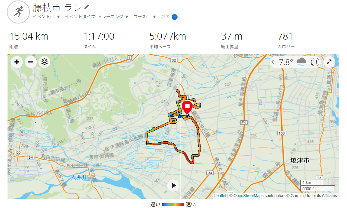 早朝2:43スタート。靴は、「adidas supernova rise2」。駅南公園、藤枝駅、駅西公園、小石川町、青木中央公園、岩城神社、青南町、高岡、泉町を経由して自宅に戻り15KM完走。向かい風は走り難かったが、気温が10℃程度まで上がり助かった。
