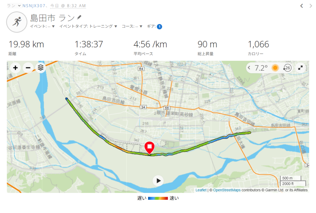 準備運動、ダッシュをしてから8:32スタート。靴は、「Nike エア ズーム アルファフライ ネクスト% フライニット EKIDEN」。ペーサーは、途中で向かい風が吹き少し走り難くなったが、ほぼ5:00/KM±10秒以内で終了。ランニングフォームは、心拍数、ピッチが抑え目で、ストライドが長めだったので良かったと思う。