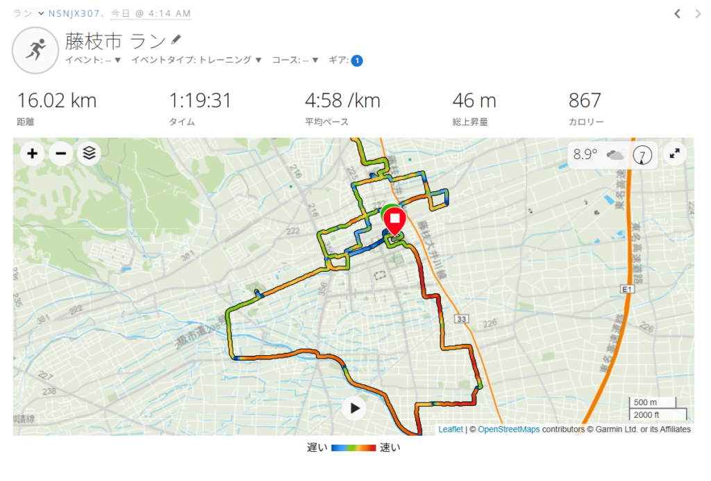 早朝4:14スタート。靴は、「adidas supernova rise2」。自宅から前島神社、小石川町、青木中央公園、岩城神社、青南町、高岡、泉町、高洲を経由して自宅に戻り、予定よりも少し長めの16KM完走。右足のハムストリングスの張りは気にならなかったので、日曜日は無事にスタートラインに立てそうである。
