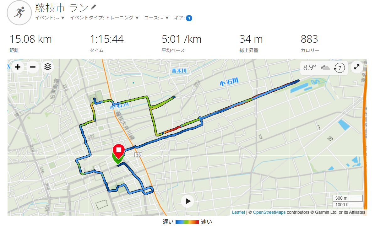 今日は、インターバルトレーニング。JOGや起伏走ではスマホをホルダーに入れ腰に取り付けて走っているが、インターバルトレーニングはペースが速いので避けていた。負荷を上げるため、インターバルトレーニングでもスマホを取り付けることにした。約400g重くなるので、今までのペースと単純に比較は出来なくなるが、年齢による筋力低下を少しでも防ぐためトライしてみたい。