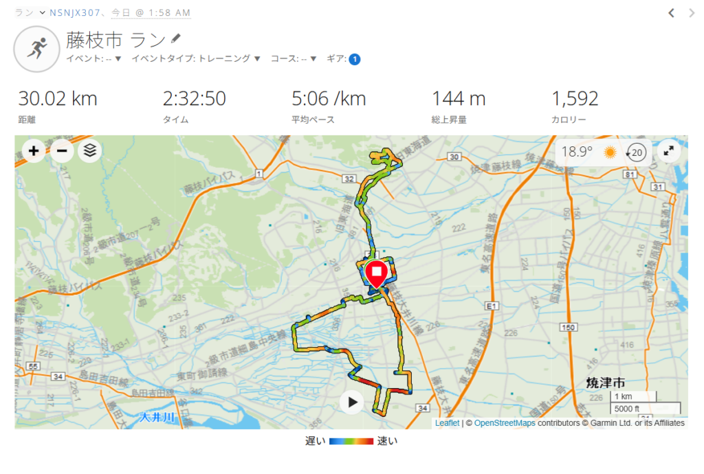 早朝1:58スタート。靴は、「adidas supernova rise2」。自宅から藤枝駅、駅南公園、岩城神社、青南町、大洲、泉町、小石川町、青木中央公園を経由して蓮華寺池公園に向かう。公園の温度計は「4℃」を示していたが、寒さは感じない。池の周囲を7周して自宅に戻り30KM完走。