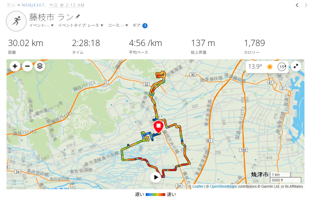 早朝2:12スタート。靴は、「NikeズームX ヴェイパーフライ ネクスト%2」。自宅から藤枝駅、静岡県武道館、駅西公園、岩城神社、青南町、泉町、高洲、高柳、小石川町、青木中央公園を経由して蓮華寺池公園に向かう。公園の温度計は「7℃」を示していて、寒さは感じない。池の周囲を8周して自宅に戻り30KM完走。靴が厚底だったので、いつもよりペースが上がった。